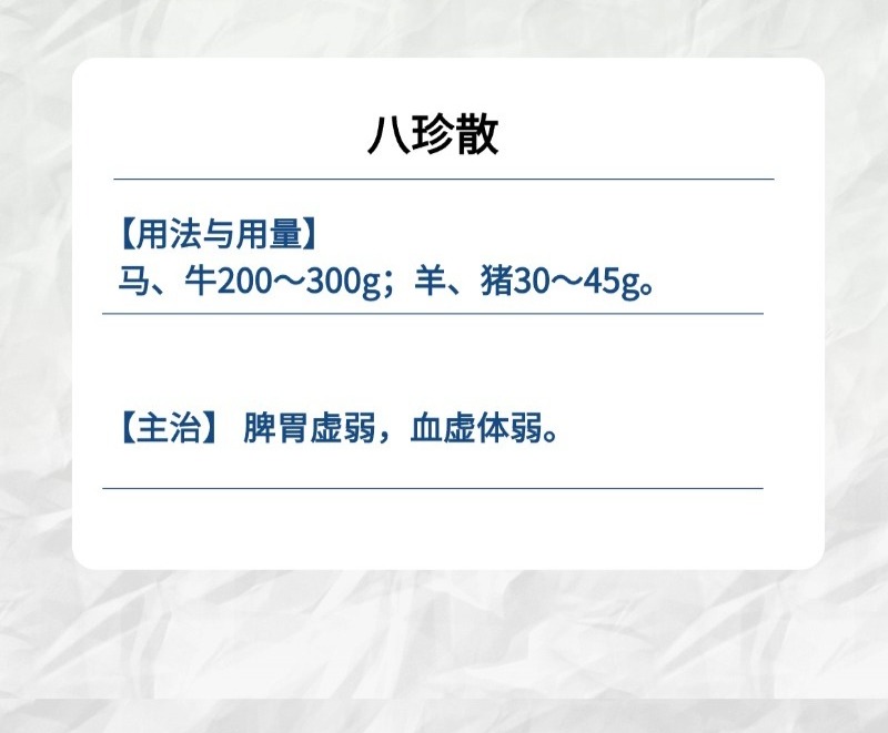 使用方法馬、牛200~300g;羊、豬30~45g。