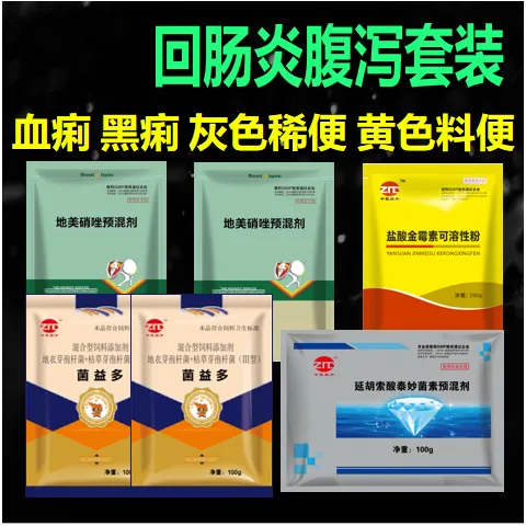 【仲牧聯(lián)和】回腸炎套裝(地美硝唑2袋+菌益多2袋+鹽酸金霉素1袋+泰妙菌素1袋)拉稀藥止痢腹瀉套餐