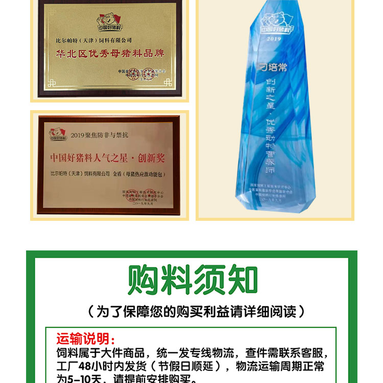 售后咨詢,物流查詢,不支持無理由退貨 承運方:天津匯佳物流,查貨請說收貨地址姓名飼料品牌,承運方電話:022-29289986 比爾帕特(天津)飼料有限公司負責人電話:13363769302 到貨時間為5-10天,當地貨站電話通知提貨