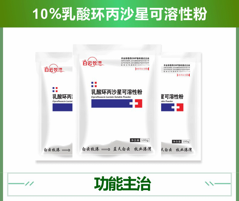 【白云牧港】 10%乳酸環丙沙星可溶性粉獸用豬牛羊雞呼吸道藥禽藥獸藥貓腸炎拉稀止痢黃白痢腹瀉